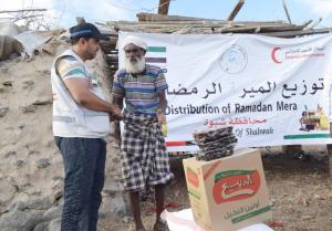 وزعت هيئة الهلال الأحمر الإماراتي اليوم الميرة الرمضانية للبدو الرحل في منطقة بلحاف في مديرية رضوم بمحافظة شبوة، وذلك في إطار جهودها الإنسانية والإغاثية التي تبذلها على مختلف الأصعدة لمساعدة الأشقاء في اليمن والتخفيف من معاناتهم وتحسين ظروفهم المعيشية.